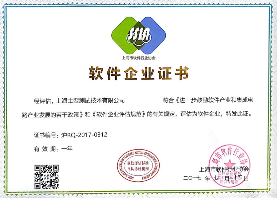 祝贺上海士翌测试技术有限公司荣获软件企业证书!