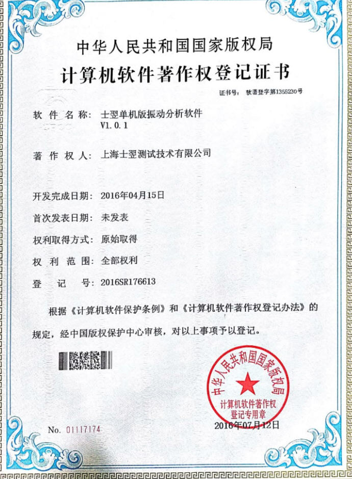 祝贺上海士翌测试技术有限公司的软件产品士翌单机版振动分析软件荣获软件著作权登记证书!