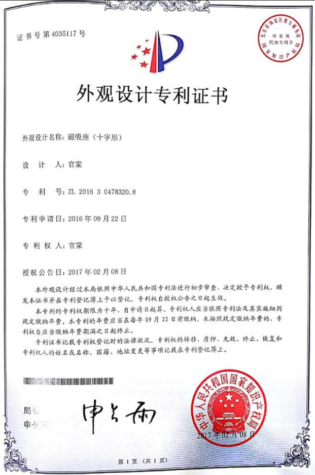 祝贺上海士翌测试技术有限公司的产品磁吸座(十字形)荣获外观设计专利证书!