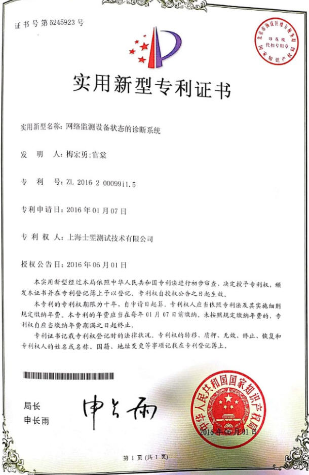 祝贺上海士翌测试技术有限公司的产品网络监测设备状态的诊断系统荣获实用新型专利证书!